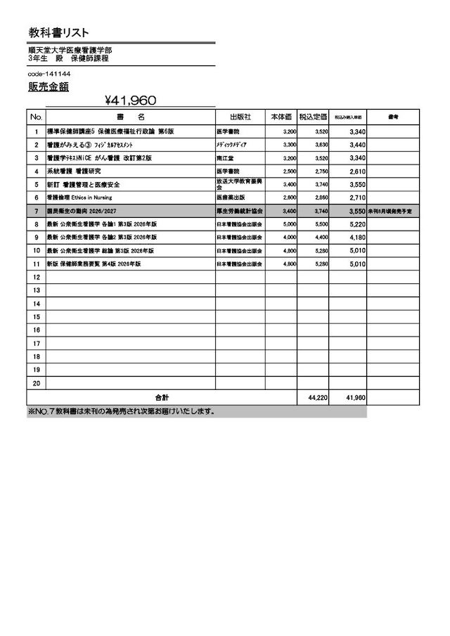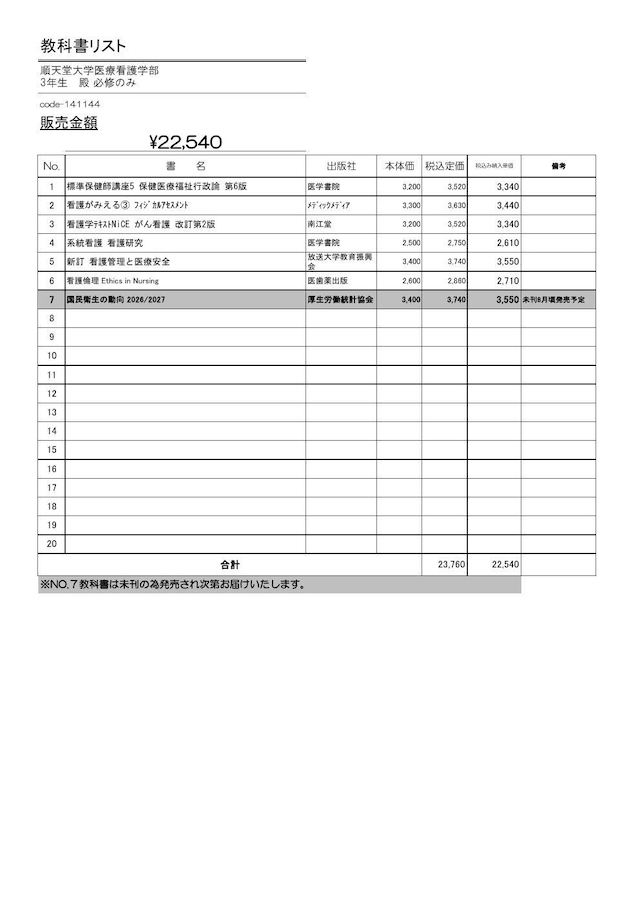 順天堂大学医療看護学部教科書販売サイト